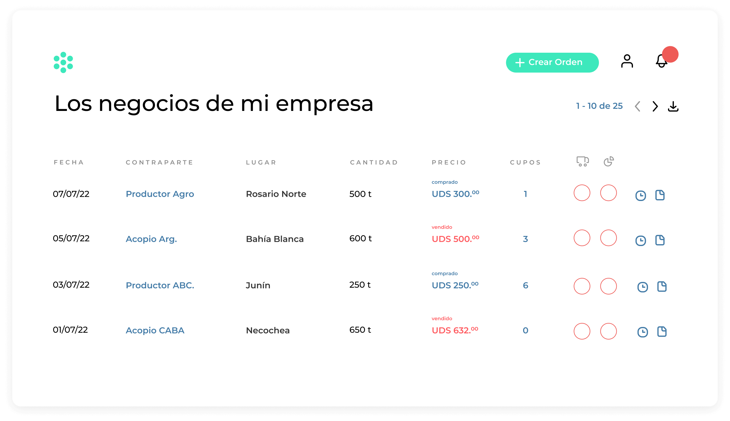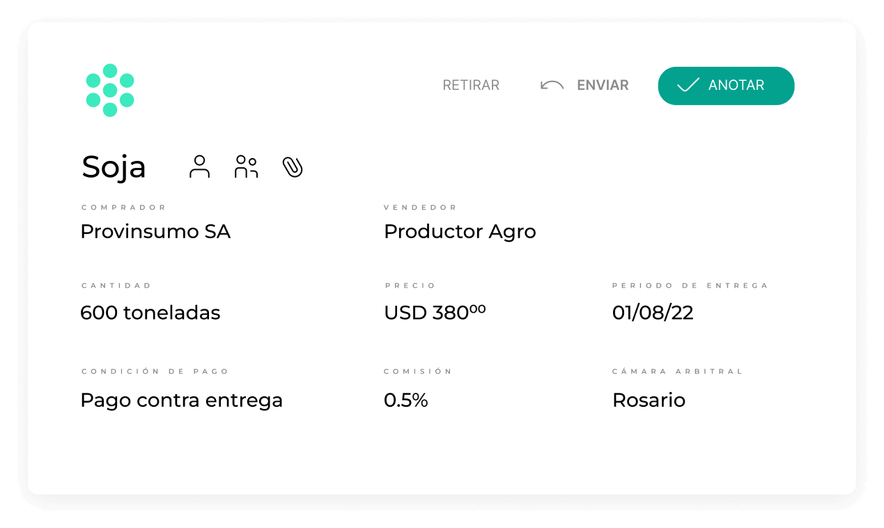 Realizá ofertas de negocios de granos y canjes. Acordá las condiciones y dale un cierre dentro de la plataforma.